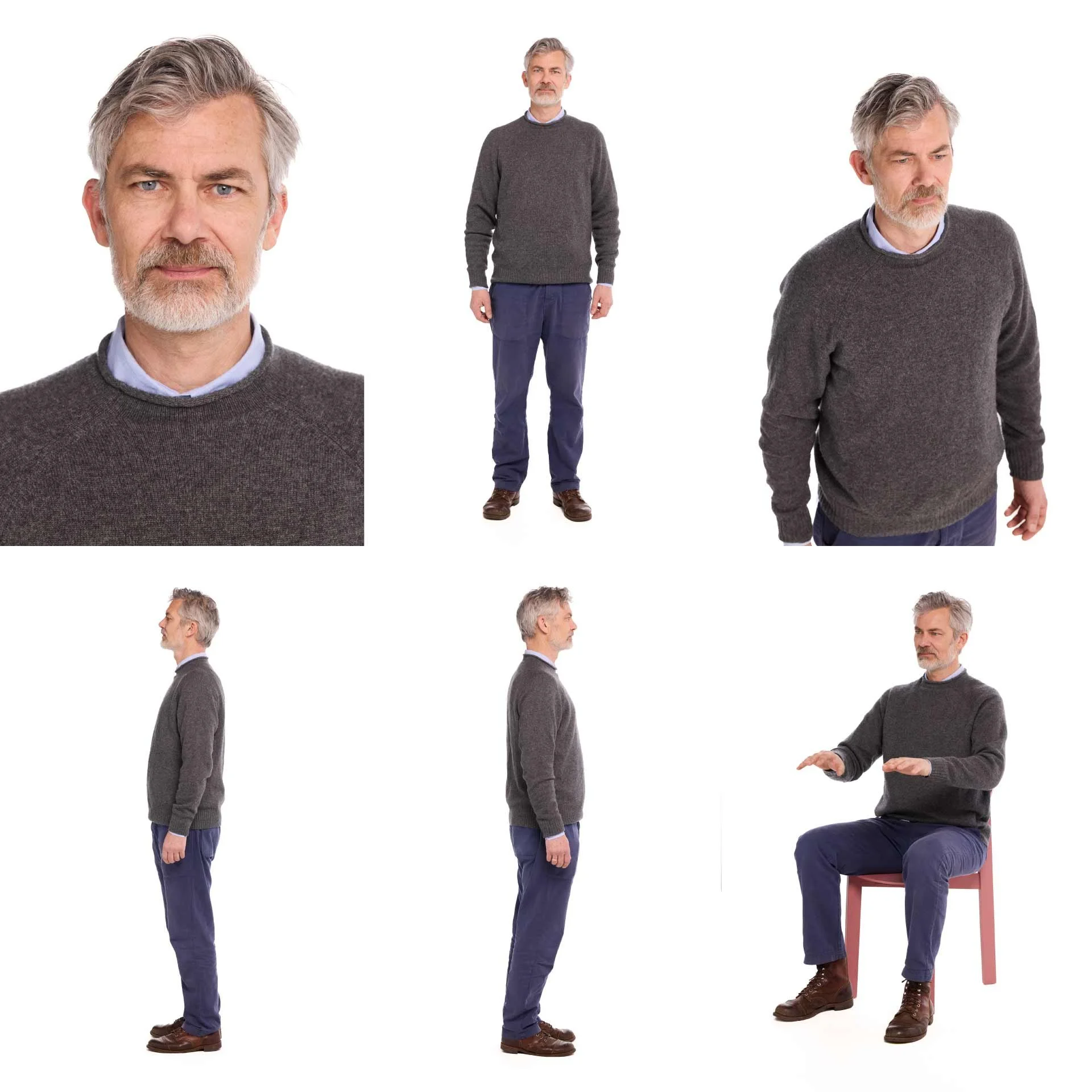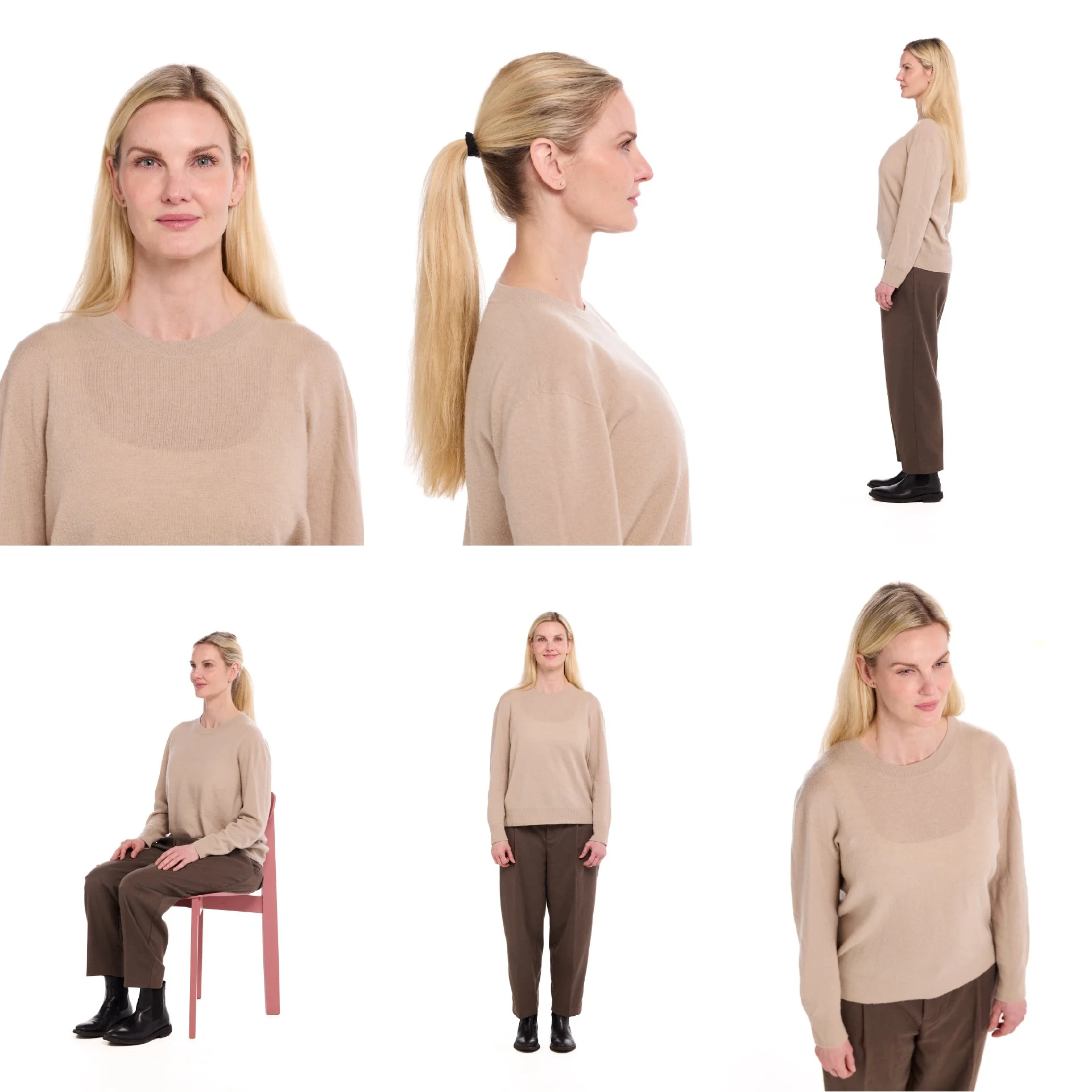 To achieve this, the shoot followed a highly structured setup. Each model was captured in a wide range of controlled angles and positions — including close-ups, full body (front, side, back), seated poses, and elevated perspectives. This ensured that the AI tool (Claibe) could accurately interpret and reproduce the models’ physical characteristics while maintaining realism and consistency across generated outputs.